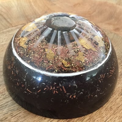 Wunderschöner, von Hand gefertigter Orgonit (17 cm) nach Reich (Unikate), welcher den Boden des cosmic harmony bildet. Er erzeugt eine starke Erdung und Verbindung zum natürlichen Erdmagnetfeld und damit eine harmonische und lebensfördernde Rechtsdrehung. DOR (deadly orgon radiation) wandelt sich um in POR (positive orgon radiation). Die Luft-Ionisierung verbessert sich deutlich. Eingearbeitet werden seltene Mineralien und Edelmetalle. Er ist bei der Lieferung sichtbar und wird zur vollen Entfaltung der 12 Dimensionen im Sockel eingebettet. Erstmalig wurde der obere Teil in Polyester-Harz und der untere Teil in Kautschuk gegossen und mit biophysikalischen Schwingungsfrequenzen informiert. Diese werden dauerhaft gespeichert und ans Umfeld abgegeben. Hier die wichtigsten: